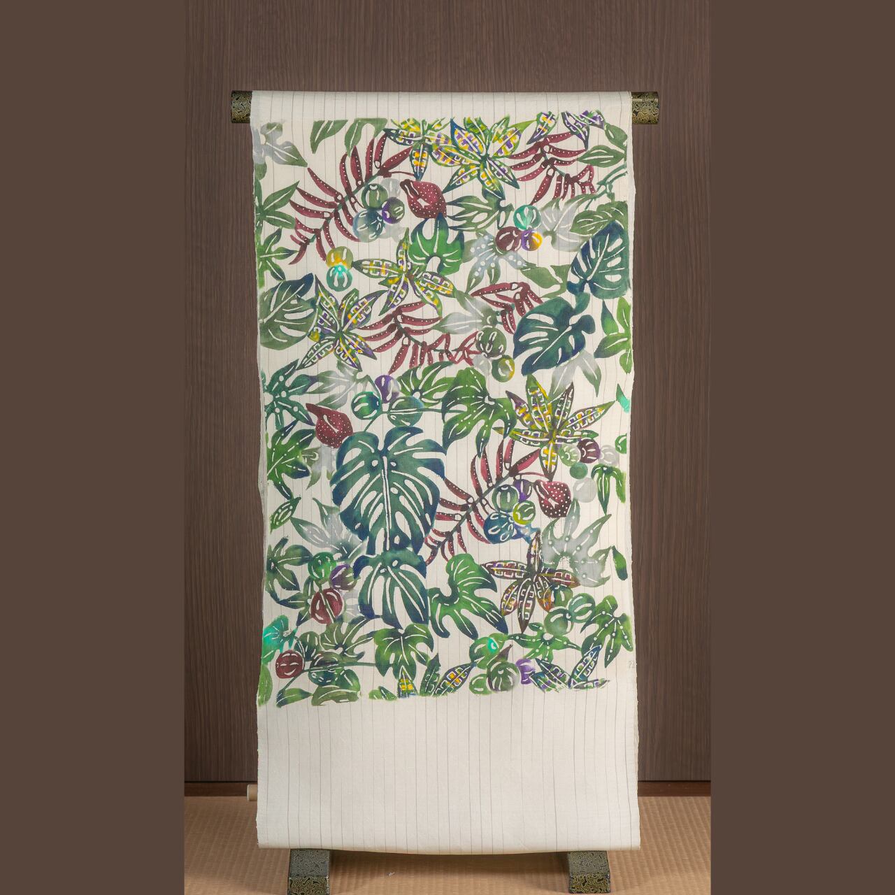 奄美大島の植物をテーマにした奄美紅型帯。沖縄の紅型に比べると大島紬に合わせやすい色彩で染めています。モンステラの葉とデイゴや琉球スズメウリを表現したデザインは奄美らしさと、和装に華やかさと優雅さをプラスします。特に大島紬に奥深い色合いが生まれどんなシーンにも調和しやすい一品です。この帯を身に纏うことで奄美の大自然を感じながらお着物ライフをお楽しみいただけます