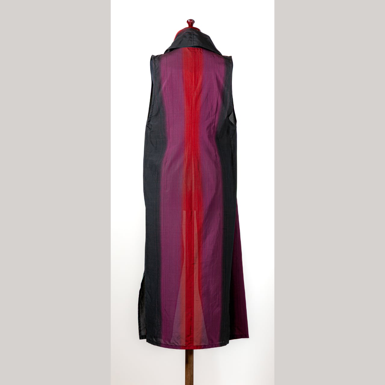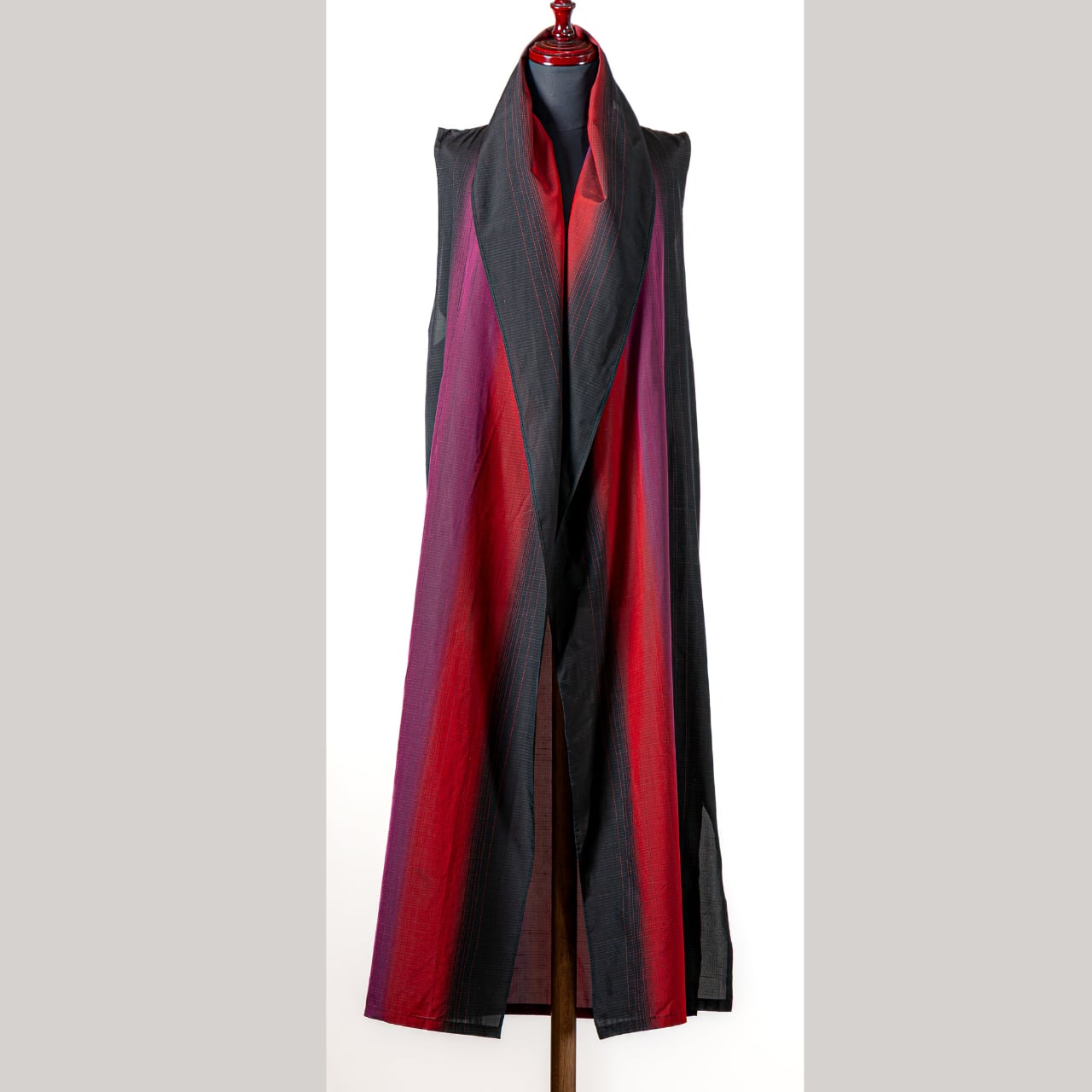 奄美大島の伝統技術が息づく大島紬ロングジレ。大島紬の絹素材を使用し、しなやかさと耐久性を兼ね備えたこのアイテムは、洗練されたデザインが特徴です。通常の大島紬よりも絹糸に強い捻りをかける事により透け感や、揺らぎ感を得られ軽やかな装いをお楽しみいただけます。